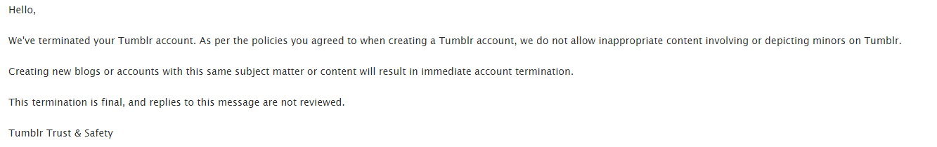 So tumblr now has a policy that prohibites that characters who are canonically underage can’t be depicted in spicy situations, even when their designs are aged up. I understand where tumblr is coming from and I endorse that they are going against sexual predators but being thrown into one pile with them by receiving this mail back:Link to mail